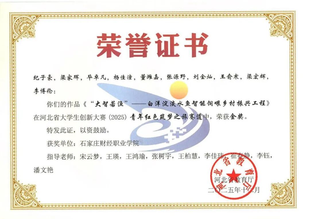 金奖项目《“大智若渔 ”——白洋淀淡水鱼智能饲喂乡村振兴工程》立足白洋淀生态养殖现状,针对传统养殖饵料浪费、效益偏低、污染水体等痛点,研发了智能饲喂系统与生态养殖方案,彰显了我校学子扎根燕赵大地、用专业所长服务地方发展的责任担当。