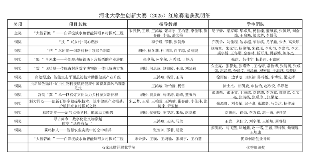 近日,河北省大学生创新大赛(2025)“青年红色筑梦之旅”赛道(以下简称“红旅赛道”)获奖名单正式公布,我校再创佳绩,斩获金奖1项、铜奖11项,宋云梦、王瑛、王鸿瑜、张树宇、王柏慧获评优秀创新创业导师,学校获评优秀组织奖。首次实现金奖突破,充分彰显学校创新创业教育的扎实成效,续写育人工作崭新篇章。