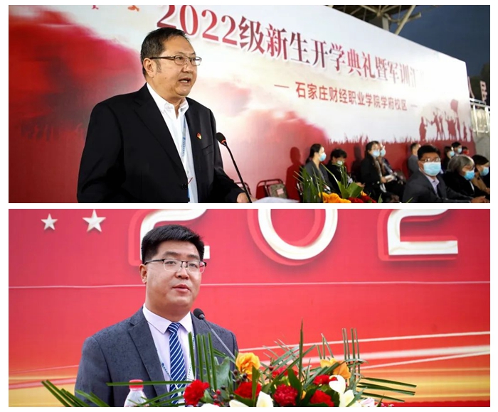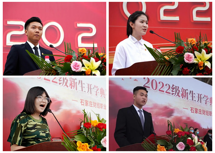 交通工程学院徐鹏璐和财经商贸学部相凯旋作为在校生代表发言,与新同学们交流感悟、分享经验。新生代表传媒学院王海楠同学和健康教育学部高欣宇祝愿2022级全体新生在财经学院可以铸就梦想,找到人生拼搏的方向。