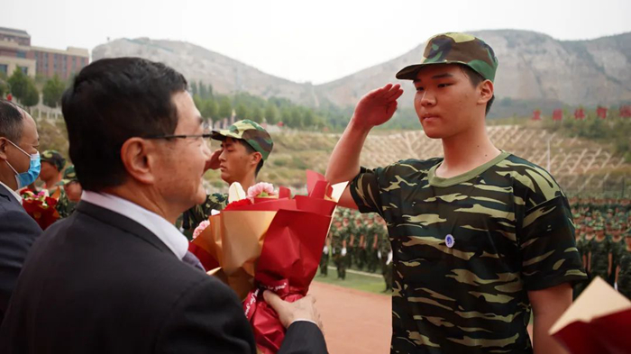仪波指挥2022级全体新生进行分列式汇报表演,同学们严阵以待、雄壮挺拔、信心百倍,向领导和老师们展现出了豪情满怀、奋发向上的风采。