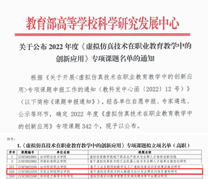 为贯彻落实《国家创新驱动发展战略纲要》《国家职业教育改革实施方案》《职业教育提质培优行动计划(2020—2023年)》等文件精神,助力职业教育数字化升级,探索虚拟仿真赋能职业教育教学的新思路、新模式、新机制,进一步推动国家职业教育虚拟仿真示范实训基地及职业教育示范性虚拟仿真实训基地建设,教育部组织了《虚拟仿真技术在职业教育教学中的创新应用》专项课题申报工作。该专项课题在全国高职院校范围内选拔,申报立项数量多,评审难度系数大,河北省仅有6项获批,其中我校《基于虚拟仿真技术的大数据与会计专业群实训体系重构研究》课题获得立项,课题编号:ZJXF2022259。
