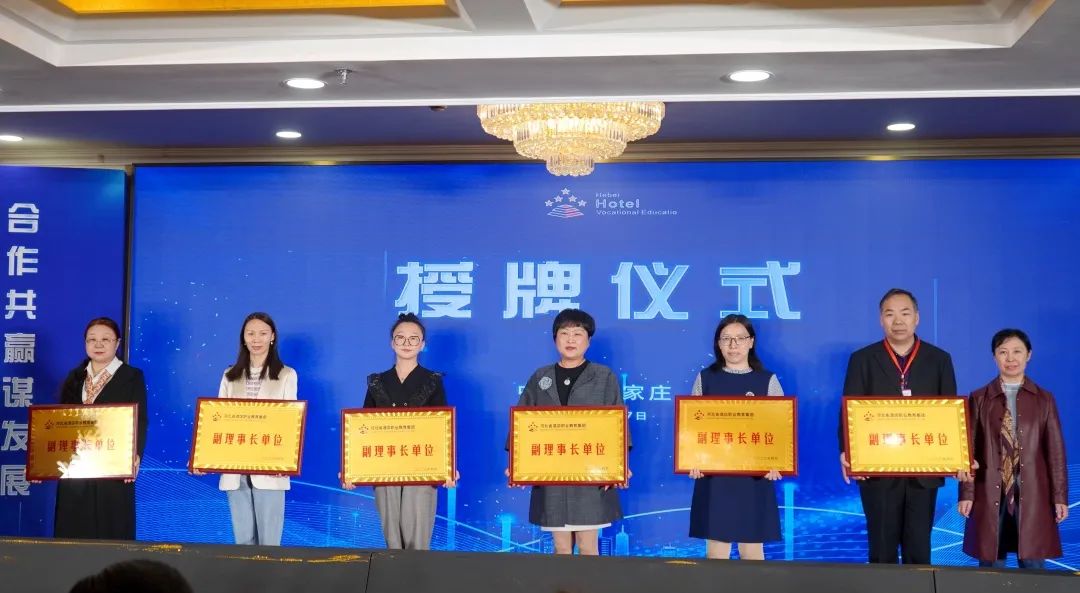 伴随着热烈的掌声,刘晶、刘永涛、刘桂玲、王玉苗、杨永利、肖石震、赵建华、李文涛、许继海等9位领导共同为河北省酒店职业教育集团揭牌。