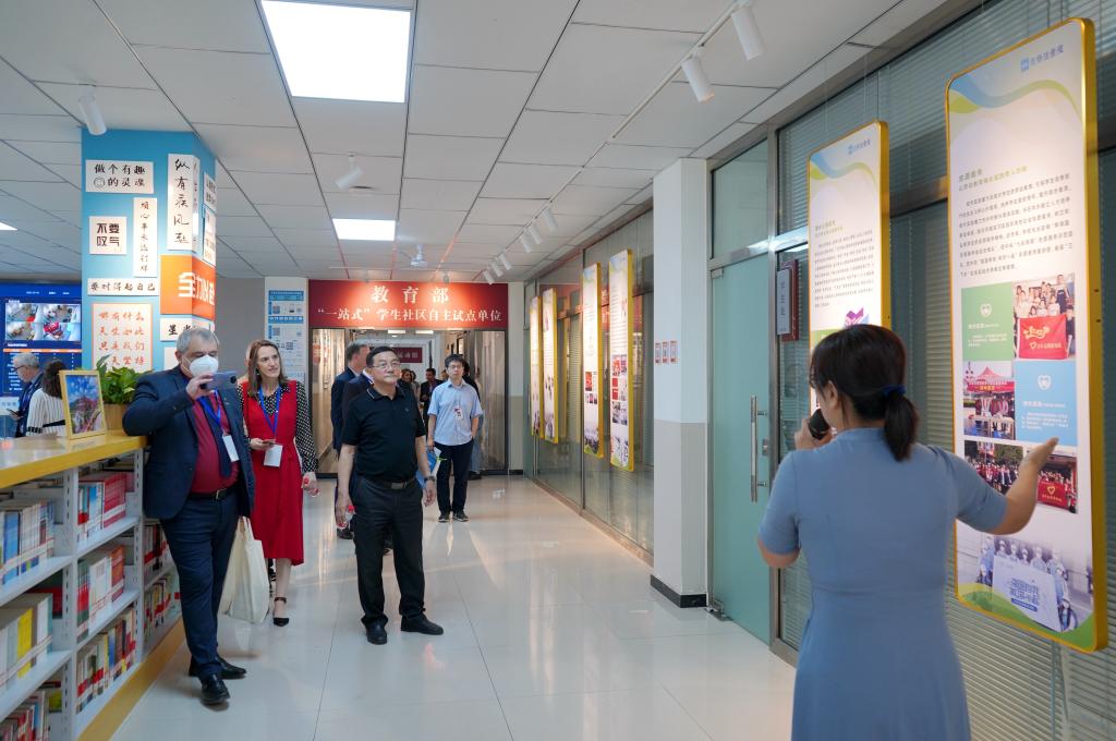 董事长肖瀚、校长赵建华、学校总监李文涛、党委副书记肖玉辉、副校长王永利、郑彦慧接待了巴西高校校长团,并陪同参观了学校各实训中心。学校各部门相关负责人为来宾讲解了各学院的发展建设情况以及教学、实训情况,并邀请来宾参与了实训模拟体验。随后,来宾参观了一站式学生服务大厅、教学运行中心和展室群。代表团成员对学校的发展成果、教学设施、国际化水平表示赞叹,并深入了解了河北省高职院校的发展情况。