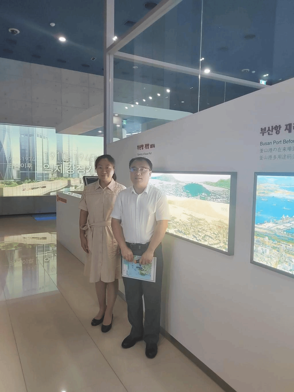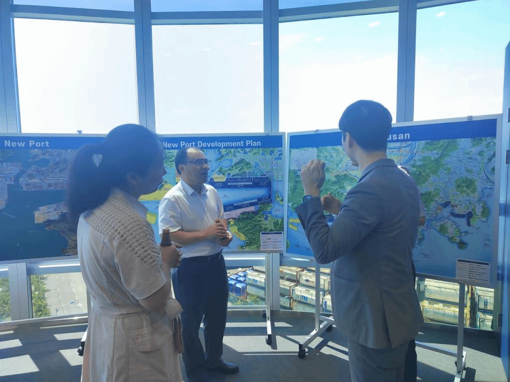 此次学习考察的行程还包括了釜山物流港。釜山港位于韩国东南端,是连接太平洋和欧亚大陆的海上枢纽,既是韩国第一大港口,也是世界第六大集装箱港口。教师团队在工作人员的陪同下了解了港口的总体设计与运行情况,并与随行韩国高校教师就产教融合实训基地建设问题进行了探讨。