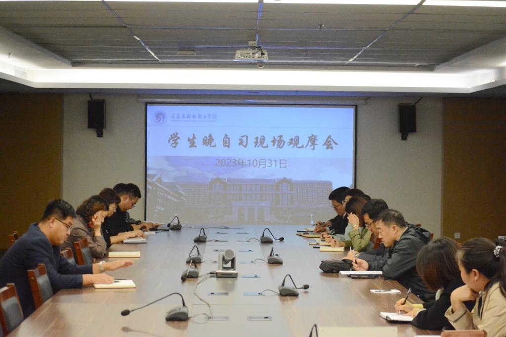 随后,与会人员深入教学楼各教室、运动场实地查看了学生在室内晚自习状态和室外活动参与等情况,并对现场观摩过程中发现的细节问题进行交流和进一步规范。同时,信息工程学院作为代表向大家分享了如何协调学生晚自习与学生活动冲突时的典型经验做法。