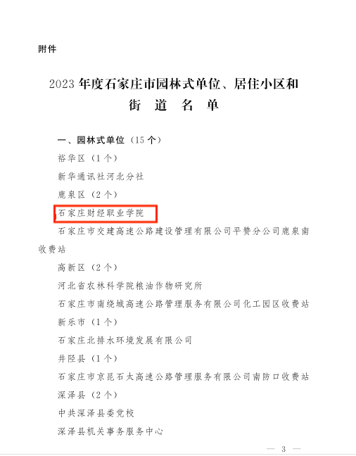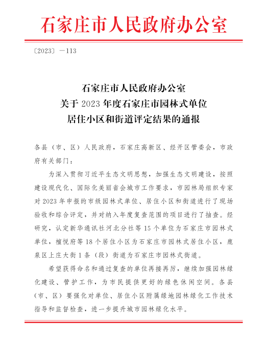 近日,我校被石家庄市人民政府办公室授予2023年度石家庄市“园林式单位”荣誉称号,这项荣誉是对我校多年致力于校园绿化生态环境提升工作的肯定。