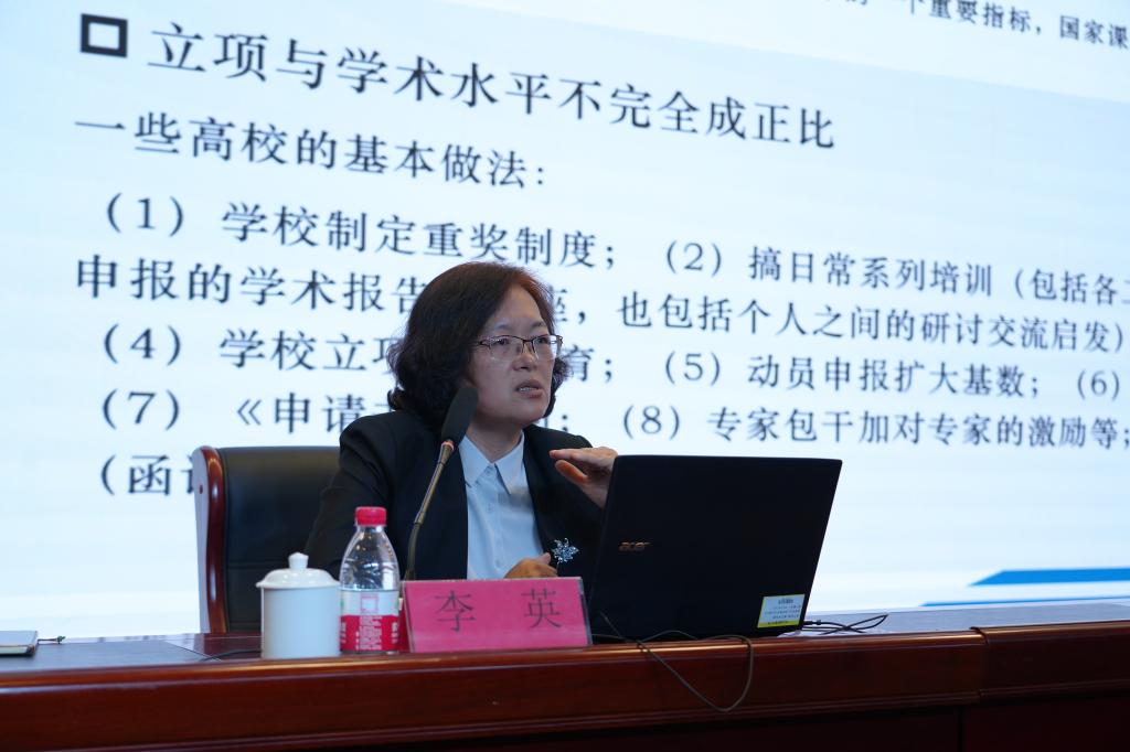 李教授以《项目申报及注意要点--以国家社科基金为例》为题,从对国家社科基金项目的“追求”、国家社科基金编制指南、国家社科基金项目函审指标设置、申报选题的确定、如何做好国家社科基金课题的研究综述和内容等方面展开,点出了项目申报书撰写时需注意的事项。同时,分享了她在课题申报、教学研究等领域的深度思考与独到见解。她的讲授既有宽阔的战略视野、又有缜密的逻辑思维;既有丰富的理论依据、也有生动的自身实践案例,为我校课题申报提供了宝贵的启示和借鉴。