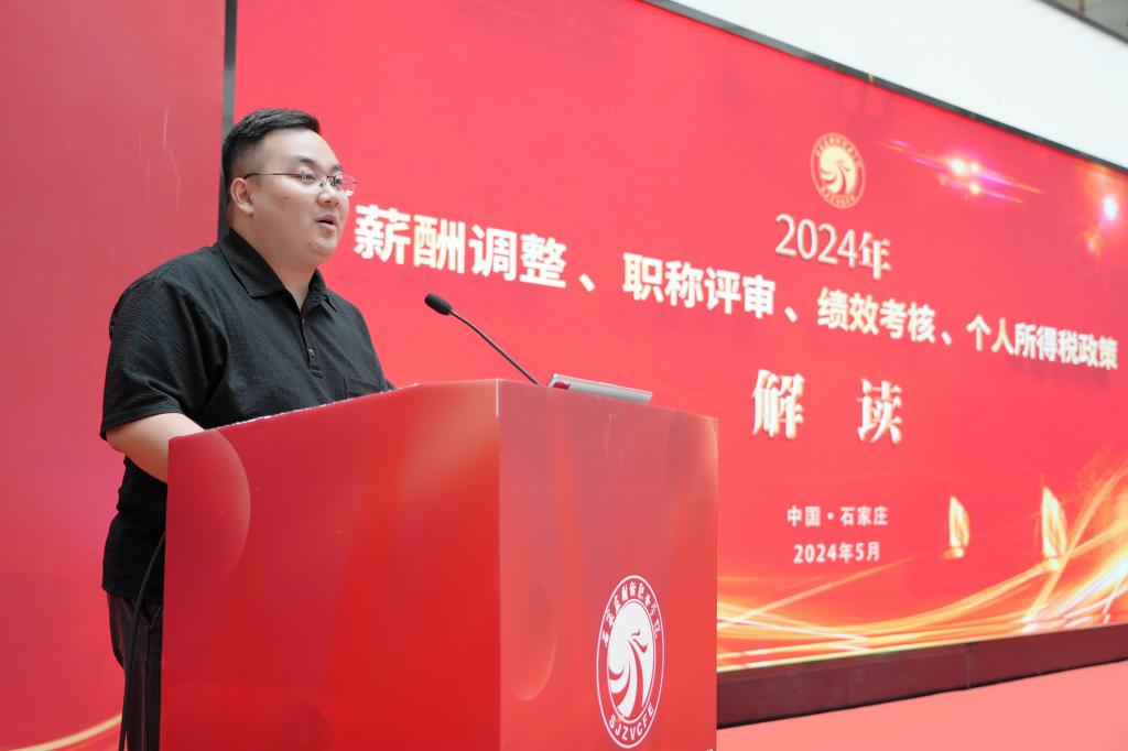 为进一步激发教职工的内生动力,提高教职工职业幸福感。5月29日下午,我校在卧龙校区图书馆二楼召开2024年薪酬调整、职称评审、绩效考核及个税政策解读会,详细解读与学校发展规划以及教职工切身利益息息相关的文件方案。学校校长赵建华,党委书记薛向东,副校长高森、李同鑫,校长助理赵振新、邓佳星出席会议,全体教职工参加。会议由校长助理赵振新主持。