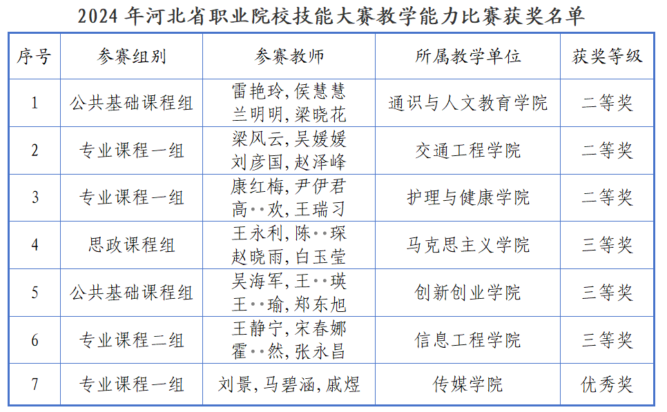 近日,河北省教育厅发布了2024年河北省职业院校技能大赛教学能力比赛结果,我校选拔推荐的7支团队参赛,荣获二等奖3项、三等奖3项,优秀奖1项,获奖作品总数和获奖等级创历史新高。