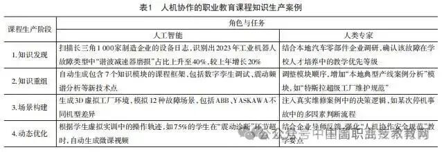 在学校条件逐渐成熟的情况下,通过角色分配,我们将能够实现“机器洞察规律,人类把握方向”的新型课程知识生产生态。以“工业机器人系统运维”课程为例,表1呈现了人机协作进行职业教育课程知识生产的基本过程。