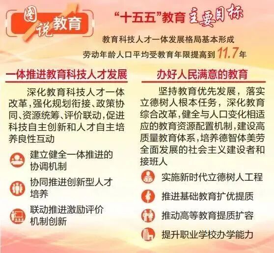 教育科技人才一体发展格局基本形成。劳动年龄人口平均受教育年限提高到11.7年。